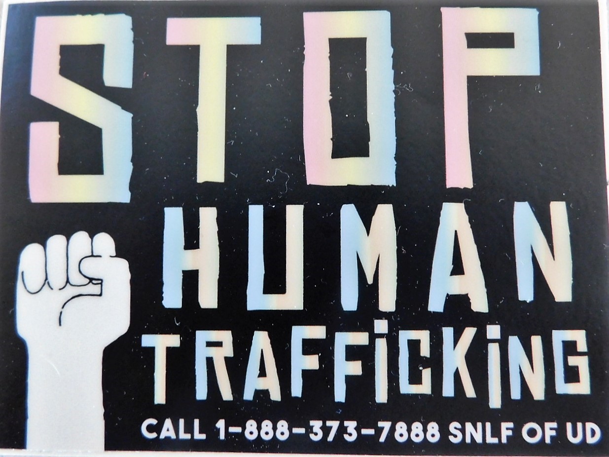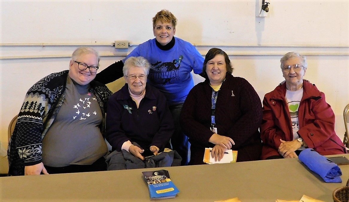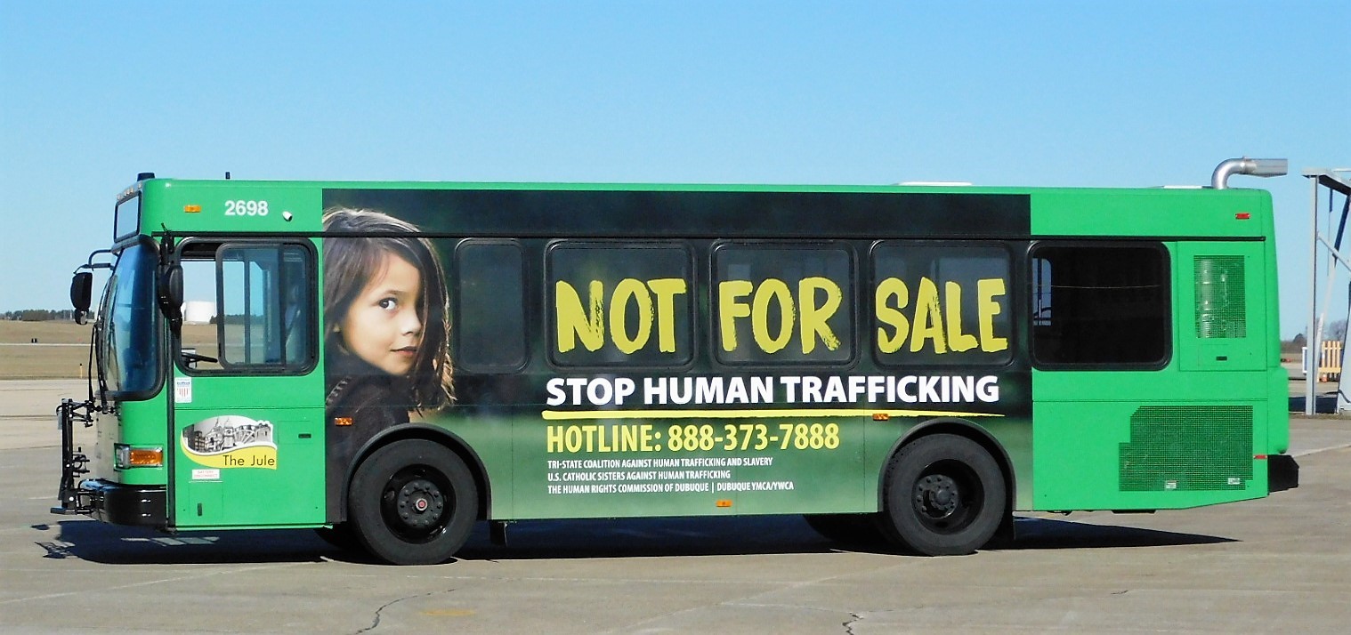 The Coalition’s bus wrap was present and is pictured. Also pictured is Irene Lukefahr, bvm, walking the 5K; a group of community members walking the 5K; some of UD’s Spartan Nation Liberation Foundation’s members with their advisor Kim Hilby; Coalition members Suzie Wright, Mira Mosle (bvm), Kasey Klein, and Diane Rapozo (bvm) with Telegraph Herald reporter Michelle London; and SNLF’s organization sticker.