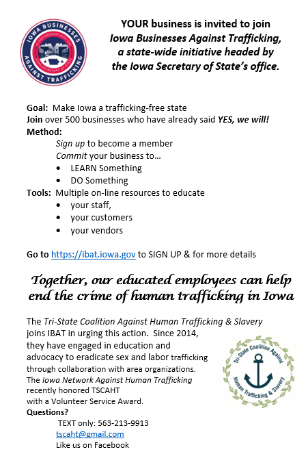 Check out the Coalition’s newest venture to engage Iowa businesses in their efforts to raise awareness of human trafficking in Dubuque and Dubuque County.
