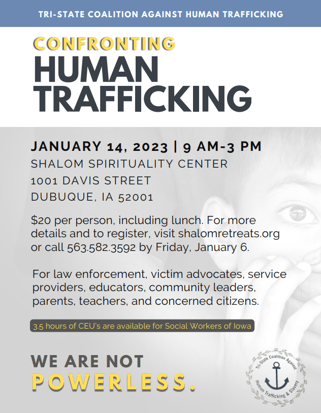 The Tri-State Coalition Against Human Trafficking is hosting a retreat entitled Confronting Human Trafficking on January 14, 2023, from 9 AM- 3 PM. January is National Human Trafficking Awareness month. Start the year off right by educating yourself on how to do your part to end the horrors of human trafficking.